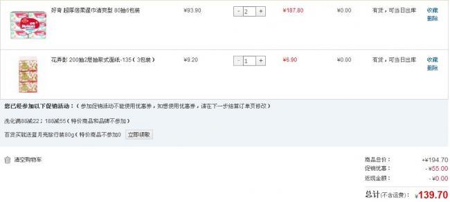 易迅網華北地區(qū)6包裝的好奇超厚濕巾報價93.9元,買2包,再湊單一包紙巾,可參加滿188減55,實際支付93.9*2+6.9-55=139.7元,合11.6/包,在購物車頁面還可以領取藍月亮洗手液一瓶。