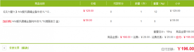 我買網(wǎng)華北站活動,愛氏晨曦全脂牛奶,12盒129元,合10.75/L。再加59元能多買6盒,加上之前的12盒總共是18盒,價格為129+59=188元,合10.4/L。最近始終沒有很便宜的牛奶,這個應(yīng)該算可以的了吧。