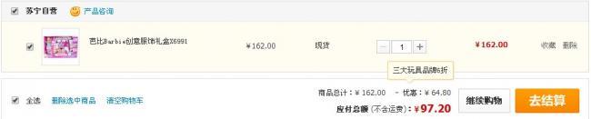 現(xiàn)價162元,下單6折后實付97.2元,當當網(wǎng)現(xiàn)價129元,京東139元,國美、1號店188元,淘寶94元。