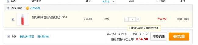 蘇寧易購特價34.5元包郵(報價69元,加入購物車5折,實付34.5元),歷史最低,同款京東商城59元,亞馬遜61.8元。