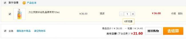 蘇寧易購(gòu)報(bào)價(jià)36元,下單6折,即21.6元包郵,近期包郵好價(jià)。