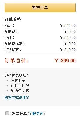 亞馬遜 Z秒殺報(bào)價(jià)399元包郵,在秒殺頁(yè)面 家居 分類 并直接加入購(gòu)物車才能以搶購(gòu)價(jià)購(gòu)買(mǎi),在訂單確認(rèn)頁(yè)面輸入優(yōu)惠碼5KHB42KK,最后實(shí)付299元,雙重優(yōu)惠了。