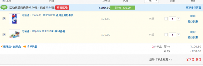目前此款馬培德(Maped)CH899943 學習套裝,今日京東商城降價只79元,本來就是歷史低價,還可以參加滿99-30的活動,可以和同品牌報價21.9元的訂書機湊單,滿減下來實付兩件70.8元包郵,其他渠道單是學習套裝都在129元以上。