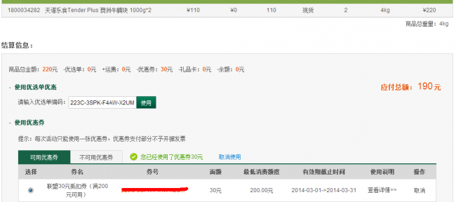 目前順豐優(yōu)選報(bào)價(jià)110元,可以湊單使用沒得比提供的滿200-30元優(yōu)惠券滿減下來190元包郵,另外支付寶新注冊(cè)用戶首次下單再減15元,實(shí)付175元,共1000*4,約合21.9元/斤的好價(jià)了。