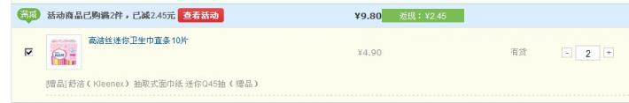 目前此款商品今日京東商城報(bào)價(jià)4.9元,本身就是低價(jià)了,還可以參加滿2件享75折的活動,約合3.7元/件,同時(shí)再贈送一件迷你Q抽紙一包。