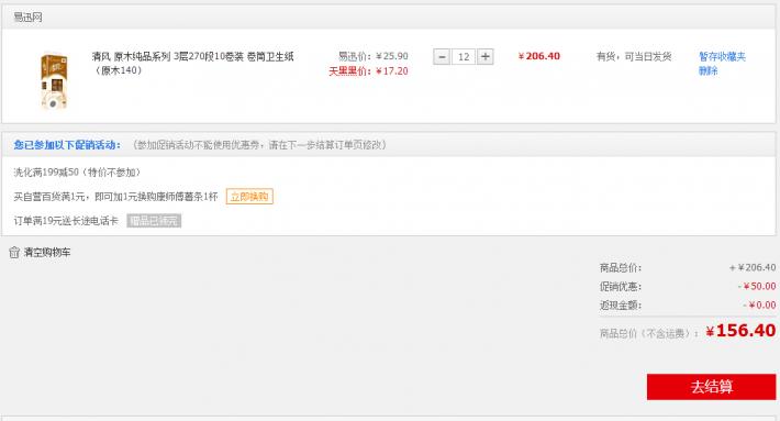 易迅網華東地區(qū)17.2元天黑黑搶購中,本身就是低價了,還可參加滿199減50元,測試這次不限購,所以直接滿12卷即可減免50元,折合下來每卷僅需13元,差不多也是超市的6折了.