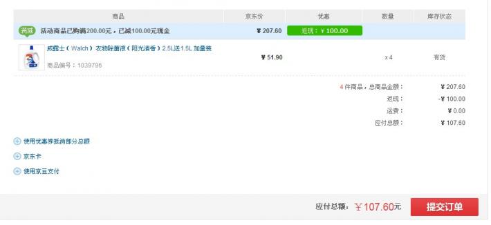 威露士(Walch) 衣物除菌液(陽(yáng)光清香)2.5L送1.5L 加量裝,京東商城標(biāo)價(jià)69.9元,銅牌及以上用戶購(gòu)買超過2件即可享受51.9元/桶的價(jià)格,湊單買4桶,還可參加“滿200-100”的活動(dòng),滿減后僅需107.6元包郵入手,折合26.9元/桶。這個(gè)價(jià)格絕對(duì)好價(jià)了,需要的一定要趁早下單。