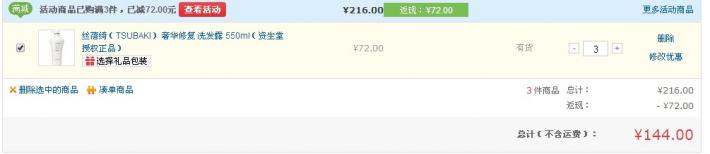 京東報價72元,本身已比其他渠道報價低,現(xiàn)在還參加買三免一的活動,買三瓶144元,折合48元一瓶。
