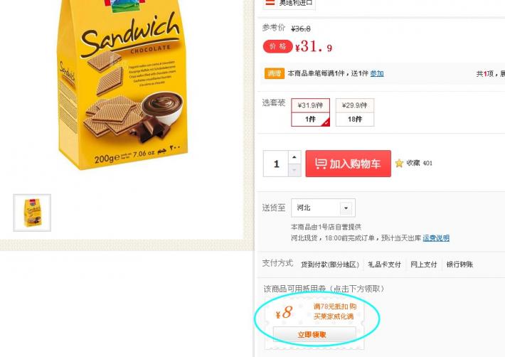1號店華北、華東地區(qū)目前有貨,報價31.9元,并且參加買一贈一,合15.95元/袋,歷史新低價,平時一般特價的時候要20+/袋。并且下方可以領取萊家威化食品滿78元減8元的優(yōu)惠券,湊單疊加使用后能做到更低的價格。