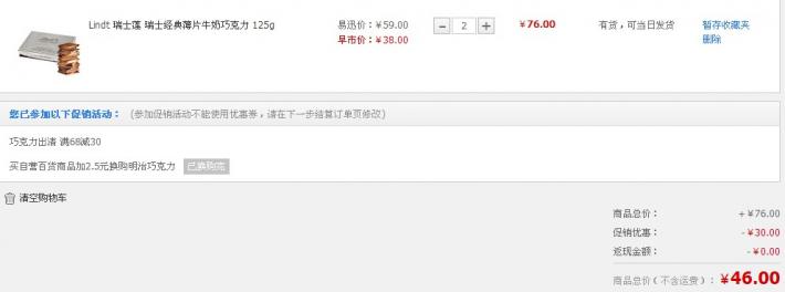 易迅北京倉目前降至38元參與早市搶購,本身就是好價格,還可參加滿68-30元優(yōu)惠活動,例如入手兩包76-38=46元,折23元/包,歷史新低了,同款京東41.3元,1號店55元在售。