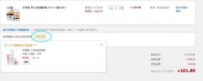 易迅網(wǎng)華南地區(qū)早市報價69.9元,買兩瓶可參加滿138減38,實際支付101.8元到手,合每瓶50.9元,并贈送歐萊雅3件套小樣,近期比較不錯的價格,其他B2C報價在80元左右。