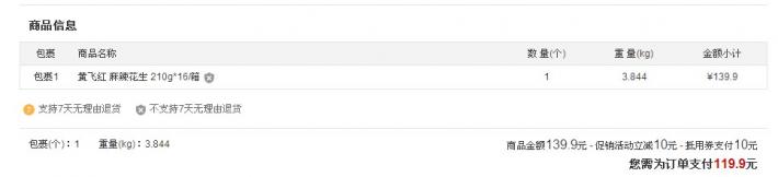1號(hào)店139.9元整箱包郵,加入購(gòu)物車變?yōu)?29.9元,用支付寶金賬戶100-10優(yōu)惠券實(shí)付119.9元包郵入手,一共16袋,折合7.46元/袋,低于超市10元/袋左右的價(jià)格,京東、亞馬遜等都是135元至150元。