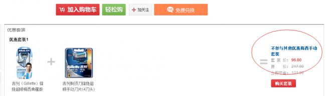 京東商城目前這款吉列鋒隱超順手動剃須刀套裝96元包郵,共包含1個刀架+5刀片。ps:在頁面中間拍套餐。