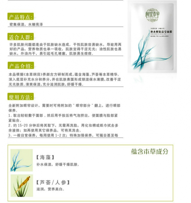 相宜本草大家都知道吧,老品牌啊,好用!補(bǔ)水醒膚晶瑩面膜具有深層保濕,美白持續(xù)補(bǔ)水,舒緩干燥,調(diào)整干燥及多油膚質(zhì)的功效,它蘊(yùn)含了海藻、蘆薈和仙人掌精華,深入肌膚底層補(bǔ)充肌膚水分,令肌膚回復(fù)水潤(rùn)光澤、晶瑩剔透,讓肌膚重現(xiàn)活力光彩的魅力!