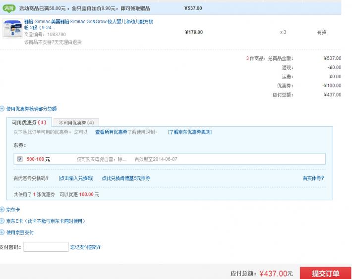 目前京東商城2段624g售價(jià)¥199,購(gòu)買2件以上¥179/件,還可使用奶粉輔食滿¥500-100優(yōu)惠券,一次購(gòu)買3件,實(shí)付¥437,折合¥145.6/件,海淘回來成本都在180元/罐以上了,麻麻們可以來拼單了