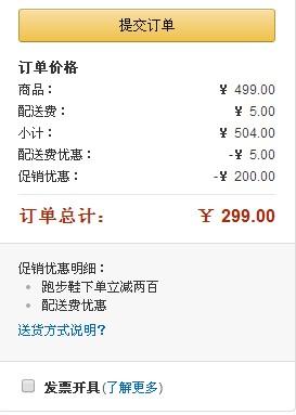 中國亞馬遜報價499元,結(jié)算時用碼“RUNNING200”減200,最終299元。