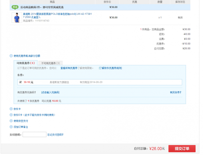 京東商城特價標價36元,可用10元優(yōu)惠券,券后26元包郵,歷史新低,買2件可打8.8折,券后低至23元,~同款凡客38元、1號店70元均不包郵。
