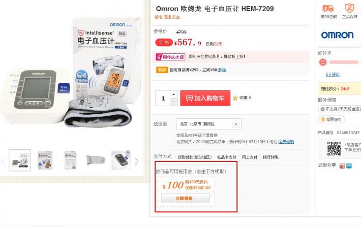 目前1號店售價567.9元,還可參加醫(yī)療用品滿299-50的活動,另外還可在價格下方領(lǐng)取100元優(yōu)惠券,下單實付417.9元,同款亞馬遜滿減后517.9元,蘇寧618元。