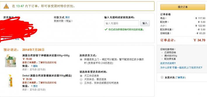 亞馬遜Z秒殺預(yù)計報價34.7元包郵,贈Dettol 滴露自然清新健康沐浴露950g,一起加入購物車,使用優(yōu)惠碼5M9F4YVMYB,最后實(shí)付34.7元包郵,同款1號店¥49.9。