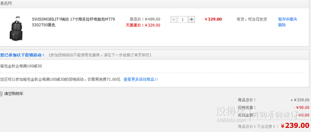 易迅網(wǎng)天黑黑降到329元,可參加箱包每滿100-30元的優(yōu)惠活動(dòng),下單立減90元,實(shí)付239元到手,單買近期低價(jià)了,同款蘇寧第三方還要459元。