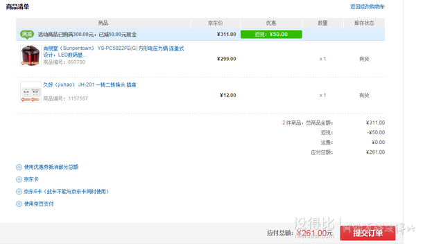 目前京東299元原本就是最低價(jià)了,還可湊單參加300-50的活動(dòng),例如湊單12元的 久好(jiuhao) JH-201 一轉(zhuǎn)二轉(zhuǎn)換頭 插座 ,2件實(shí)付261元,其他商城在400元以上。