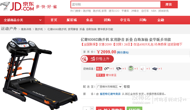億健6006D跑步機(jī)家用靜音折疊豪華版多功能,蘇寧報(bào)價(jià)1999元,可用50元年貨券,再疊加銀聯(lián)支付的滿50-10元活動,實(shí)付1939元到手,同款京東2099元,差價(jià)160元!
