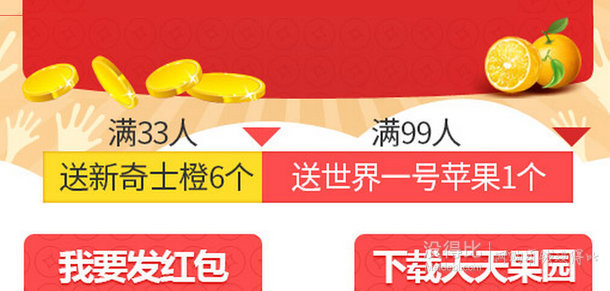 天天果園官網(wǎng)可以參加開紅包活動,33人就送6個新奇士橙,99人世界蘋果一個