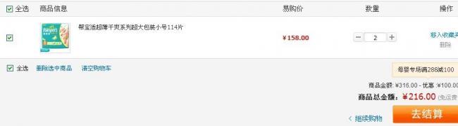 幫寶適這款紙尿褲,目前蘇寧易購(gòu)158元在售,還可參加滿(mǎn)母嬰用品滿(mǎn)288-100元活動(dòng),媽媽們可以拼單購(gòu)入2包,加入購(gòu)物車(chē)后立減100元,實(shí)付216元兩件包郵到手,折合1包108元,刷新歷史最低價(jià)格,媽媽們不要錯(cuò)過(guò)了;同款為為網(wǎng)155元,國(guó)美159元在售。