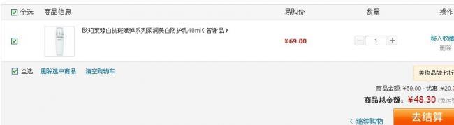 歐珀萊這款柔潤美白防護(hù)乳,目前蘇寧易購69元在售,還可參加美妝品牌5折起活動,加入購物車后立享7折優(yōu)惠,實(shí)付48.3元包郵到手,全網(wǎng)最低價(jià)格,愛美的MM們不要錯過了,同款1號商城71.5元,亞馬遜109元,京東商城120元。