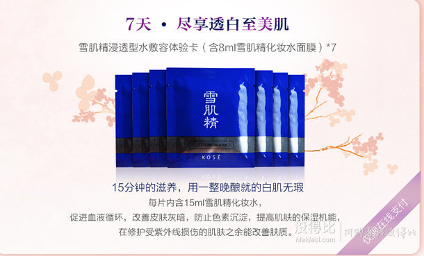 目前高絲kose官網(wǎng)正在進(jìn)行的付20元運(yùn)費(fèi),可領(lǐng)取雪肌精化妝水面膜8ml*7片,折下來(lái)還是很劃算的,官網(wǎng)發(fā)貨,個(gè)人覺(jué)得還是很劃算,淘寶不少商家單片售價(jià)都在8元以上。