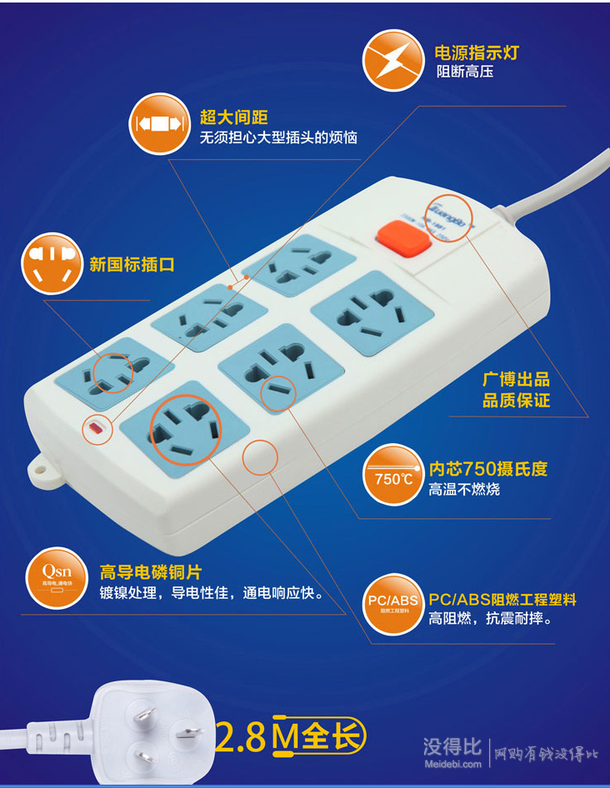 廣博出品,品質(zhì)保證。電源指示燈,阻斷高壓。超大間距,無須擔心大型插頭的煩惱。新國標插口。高導電磷銅片,鍍鎳處理,導電性佳,通電響應快。內(nèi)芯750攝氏度,高溫不燃燒。PC/ABS阻燃工程塑料,高阻燃,抗震耐摔。2.8M全長