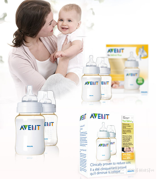 AVENT新安怡是英國著名的母嬰品牌,2006年被Philips飛利浦收購。這套對(duì)裝奶瓶包含兩個(gè)260mlPES奶瓶,采用高品質(zhì)安全材質(zhì),不含雙酚A(BPA)。瓶身造型寬大穩(wěn)固,曲線易于握持,瓶頸寬大便于清洗及方便沖泡奶粉,精確清晰的刻度可以清楚地知道寶寶喝奶的狀況。緊密的瓶蓋可以頂住奶嘴,確保搖晃奶瓶時(shí)奶水不易外溢。