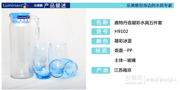 樂美雅 鹿特丹壺凝彩水具5件套 ,包括1L水壺*1+350ml杯子*4,適用于微波爐、洗碗機,瞬間耐差溫度60度。采用先進凝彩玻璃技術(shù),永不褪色,天然無孔不滲透材質(zhì),安全無鉛不易留存細菌,易清洗,無異味,防腐蝕。使用加厚的底座,拿在手里更有質(zhì)感,而且使用天然無害的有機色素,粉藍的玻璃造型,美觀漂亮。