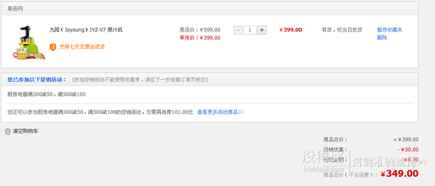 易迅網(wǎng)早市報(bào)價(jià)399元,參加滿300-50促銷,下單立減50元,實(shí)付349元包郵,持平歷史低價(jià),同款京東599元。