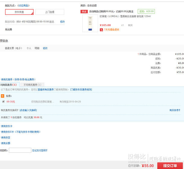 歐萊雅(LOREAL)雪顏美白潔面膏 新包裝 125ml售價(jià)105元,雙重優(yōu)惠后,僅需支付55元包郵。
