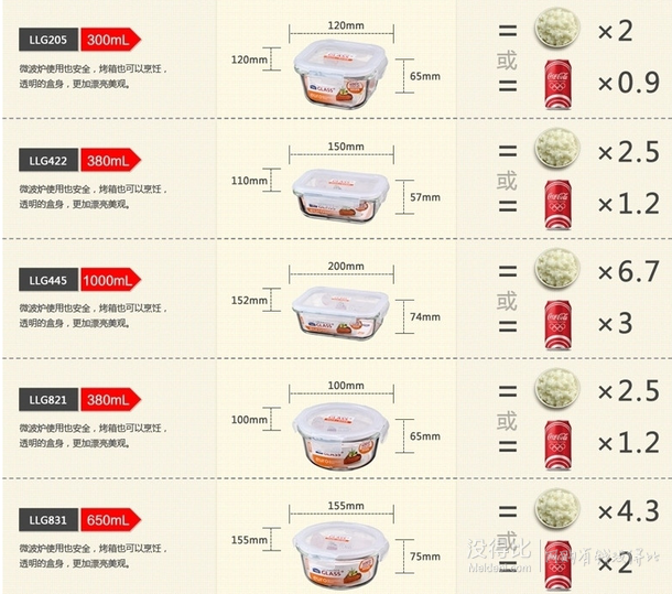 樂扣樂扣格拉斯四面鎖耐熱玻璃保鮮盒6件套LLG445S004,盒身采用耐熱玻璃材料制作,可在微波爐、烤箱內使用,盒蓋采用對人體無害的PP材質,四面鎖扣型,盒身邊緣無突起部分,擁有完美的密封性。套裝包括6個玻璃保鮮盒,分別為300ml、380ml、1L三個四方形保鮮盒,以及1個380ml以及2個650ml原型保鮮盒,容量都比較實用。