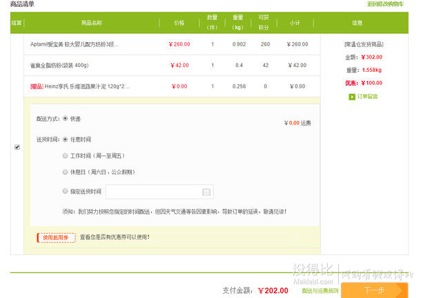 Aptamil愛寶美 較大嬰兒配方奶粉3段800g,今日中糧我買網華南站售價260元,湊單這款售價42元的雀巢全脂奶粉(袋裝 400g),參加滿299減100的活動,結算時贈送Heinz亨氏果汁泥 120g*2 ,實付201.8元包郵,折下來三段愛他美約合172元/件,全網底價,同款京東售價260元。
