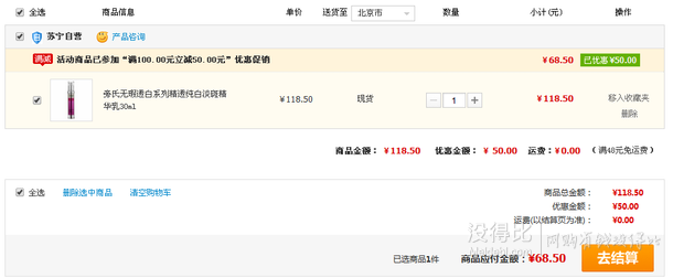旁氏 無瑕透白系列 精透純白淡斑精華乳 30ml ,蘇寧易購報價118.5元,參加滿100減50,實付68.5元到手,5折好價,同款京東115元,亞馬遜122.55元。