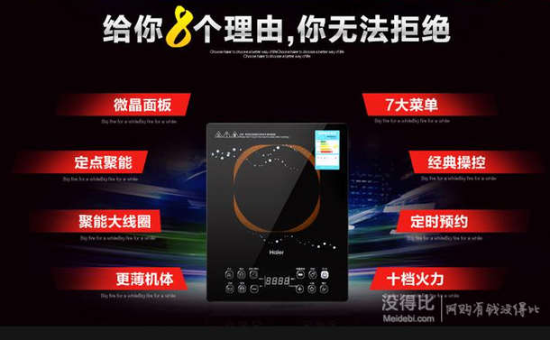 Haier海爾這款C21-H1107電磁爐,采用黑色微晶面板,高強度工藝,定點聚能,加熱均勻??深A約定時,具備七大菜單,經(jīng)典的按鍵式設計,操作簡單,十檔火力可調(diào)節(jié),功率2100W。