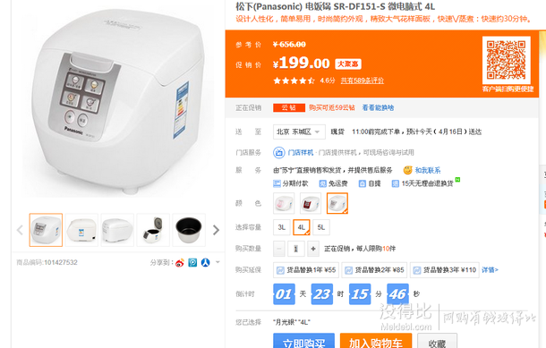 設計人性化,簡單易用。這款松下電飯鍋采用一鍵通設計,適合各年齡段的人群使用。微電腦溫控,煮飯美味,菜單多樣化。低耗電量,節(jié)能環(huán)保。超快速/蒸煮約30分鐘,規(guī)格4L,月光銀色。