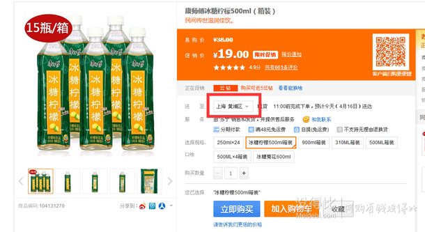 魔都福利,康師傅冰糖檸檬500ml×15瓶(箱裝),蘇寧上海地區(qū)報(bào)價(jià)19元,折合1.3元一瓶,同款單瓶裝1號(hào)店2.5元,其他地區(qū)35.9元 。