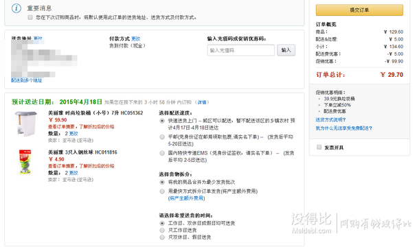亞馬遜目前59.9元,下2個,然后湊2個美麗雅 鋼絲球,一起加入購物車,在訂單結算頁面輸入優(yōu)惠碼“HHHHHH50”,實付29.7元包郵,折合才12元一個垃圾桶。