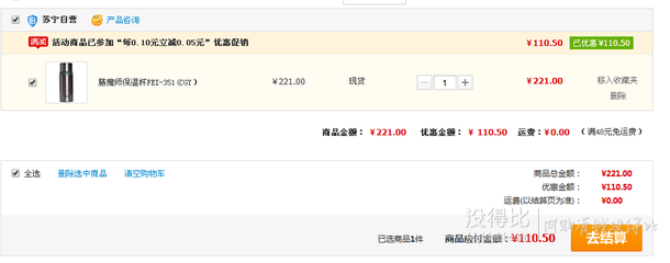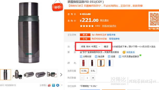 膳魔師保溫杯FEI-351(CGY)不銹鋼色0.35L,蘇寧易購河南地區(qū)報價221元,下單5折后只要110.5元包郵到手,河南的比友可入手。其他渠道300+。
