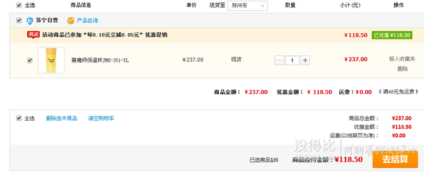蘇寧易購河南地區(qū)報價237元,下單5折,實付118.5元到手,同款京東聯(lián)營242元,當(dāng)當(dāng)聯(lián)營239元。
