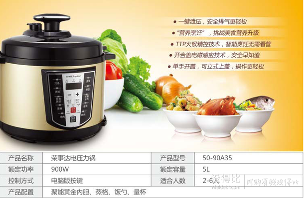 這款Royalstar榮事達電壓力鍋型號為50-90A35。微電腦式控制方式,黃金內膽,底部采用蜂窩設計,環(huán)保不粘聚能涂層,加熱均勻。5L容量,900W額定功率,24小時預約。設有自動排氣孔和萬能控壓裝置,保證安全。蒸、煮、燜、燒、燉、煲、煨、熬8種烹飪方式,并配備蒸格,一鍋多用比較方便。