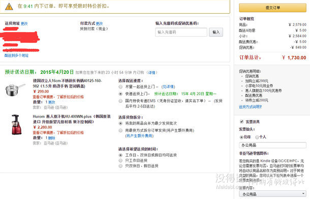 目前此款商品亞馬遜中國z秒殺售價(jià)2080,將這款售價(jià)299元的德國雙立人16cm不銹鋼長柄鍋40125-160-982一起加入購物車可免費(fèi)獲得,先點(diǎn)擊此處領(lǐng)取200元優(yōu)惠券和100元優(yōu)惠券,疊加此處領(lǐng)取滿200減50元優(yōu)惠券,實(shí)付1730元包郵,入手好價(jià),其他渠道都在1999元以上。