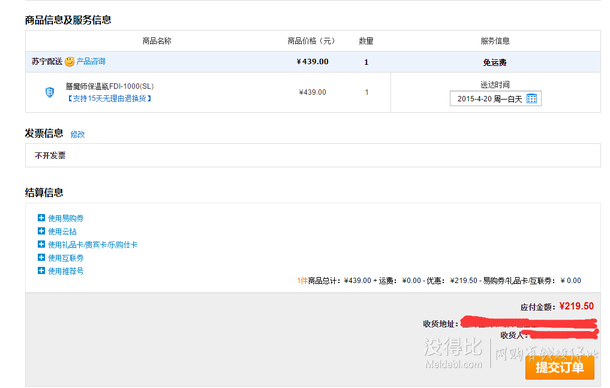 蘇寧易購西南地區(qū)目前報價439元,下單5折后實際支付219.5元包郵到手,其他地區(qū)5折后最低249.5元。同款1號店賣449元。