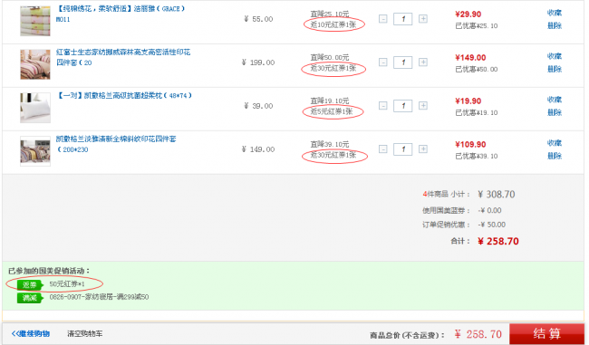 來個(gè)搭配,兩套四件套(149那套昨天買了,今天收到,手感不錯(cuò))149+109.9,一對(duì)枕頭19.9,毛巾兩條29.9,一共308.7元,滿299減50返50,實(shí)付258.7元,返125元紅券(訂單滿299返50+四件套每套返30*2+枕頭返5+毛巾返10),相當(dāng)于133.7元到手兩套四件套一對(duì)枕頭兩條毛巾~!