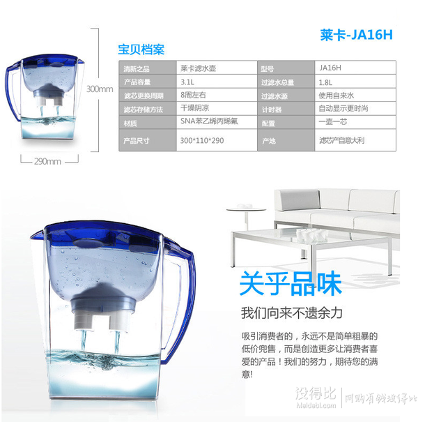 Laica是意大利最大,歐洲第二大的濾水壺制造商。這款LAICA 萊卡 3.1L濾水壺JA16H,容量3.1L,采用雙流濾芯設(shè)計(jì),比傳統(tǒng)濾芯效率高出20%,濾芯產(chǎn)自意大利,采用五重雙管高效過(guò)濾,能夠過(guò)濾除去水中的重金屬、氯氣、農(nóng)藥、鐵銹、有機(jī)污染物等有害物質(zhì);單只濾芯可過(guò)濾150L水(約8周左右),壺身免掀蓋設(shè)計(jì),頂部帶有電子計(jì)數(shù)器,可以根據(jù)已過(guò)濾的水量、使用時(shí)間,以及水的硬度來(lái)顯示濾芯狀態(tài),做出是否更換濾芯提示。