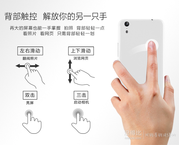 2.0GhzMTK6592Turbo真八核處理器,性能更強勁。2G+32G內存,無限緩存更為暢快。1300萬后置攝像頭搭配500萬前置,讓各方面都不落后。背部觸控,解放你的另一只手,在大的屏幕也能一手掌握,背部輕輕一點, 看照片,看網頁,只需背部輕輕一劃。一只手就能靈活掌握,左右滑動翻閱照片,上下滑動瀏覽網頁,雙擊亮屏,三擊啟動相機。